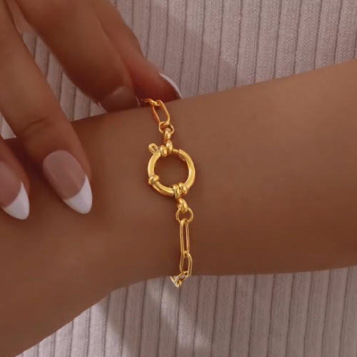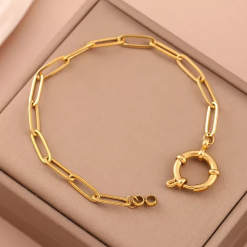 Dripping in 18K gold-plated luxury, this bold yet timeless chain bracelet features a sleek paperclip link design with a trendy toggle clasp, making it the perfect blend of edgy and elegant.