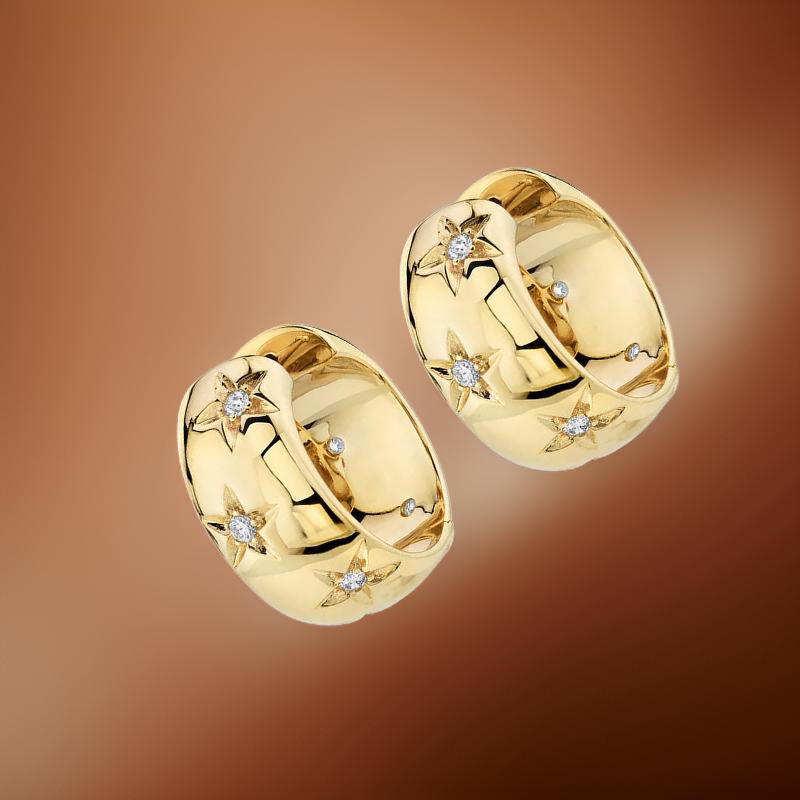 Crafted from 18k gold plated metal, these hoop earrings are designed to make a statement. Adorned with clear diamond stars, they add a touch of celestial charm to any ensemble.