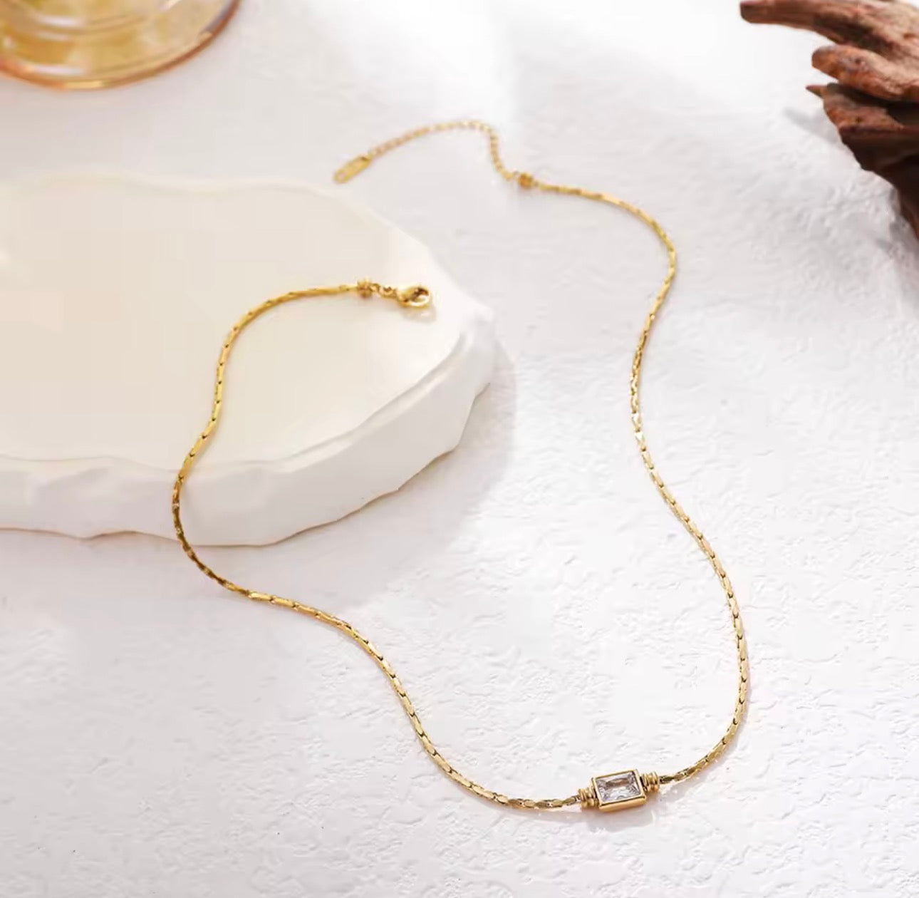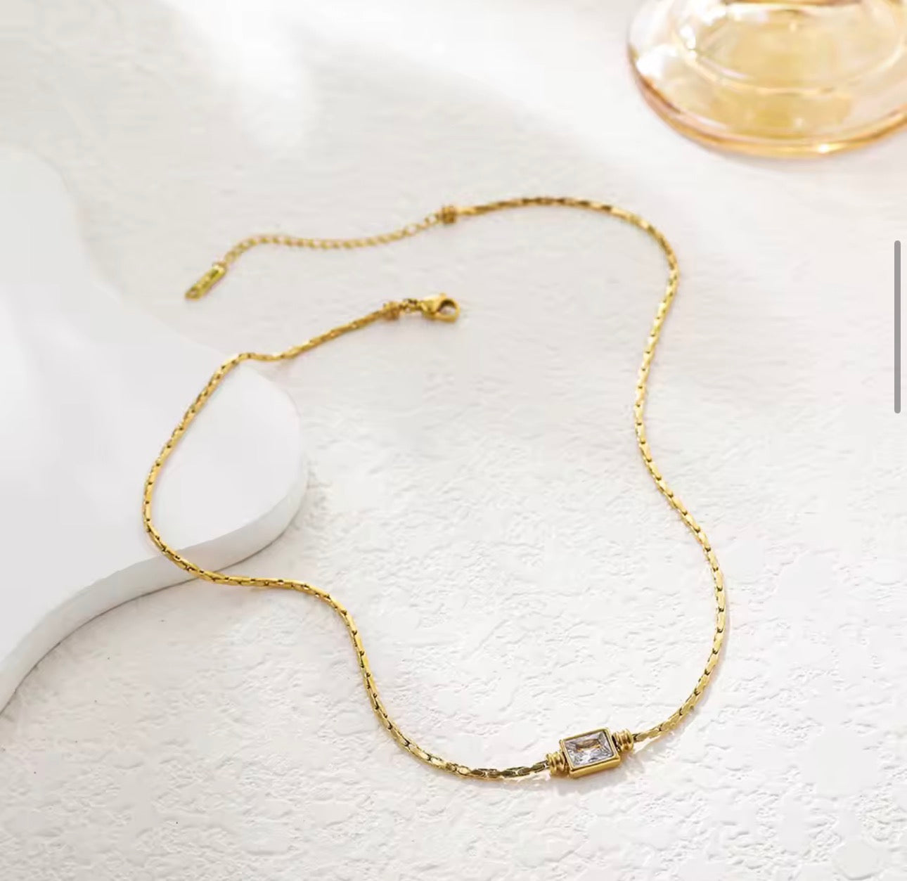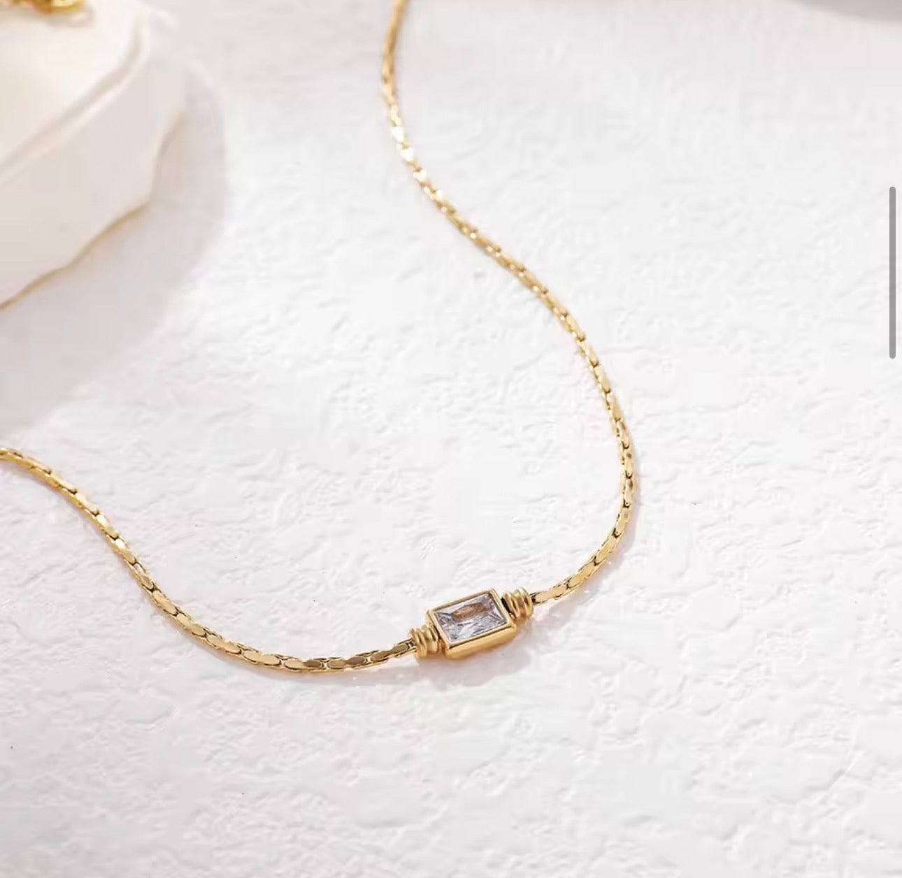 Meet Elianne, the herringbone necklace that knows how to make an entrance without saying a word. This waterproof, non-tarnish beauty features a mesmerizing herringbone chain that catches light from every angle, crowned with a show-stopping emerald-cut crystal that's basically jewellery poetry in motion.