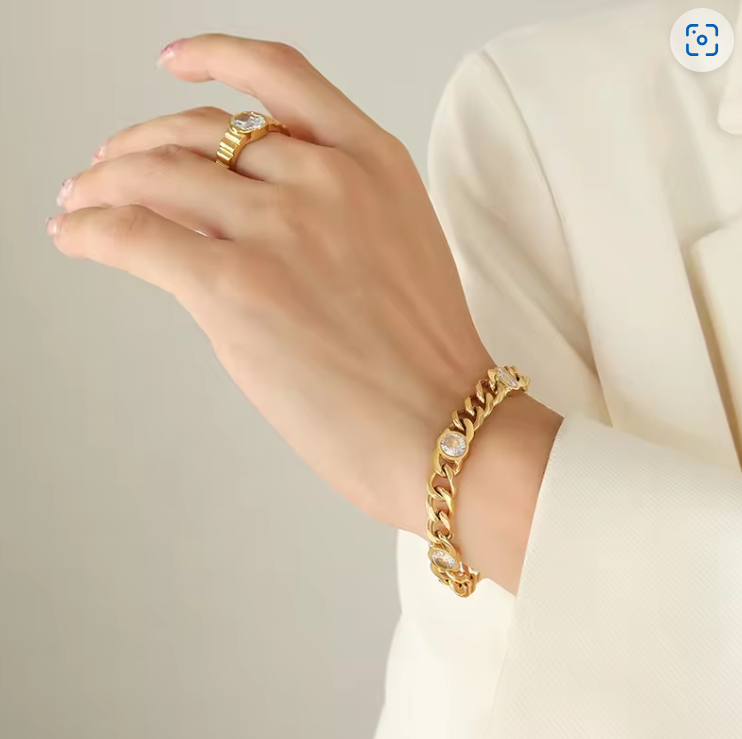 Crafted with care, this 18K gold plated bracelet features a chunky Cuban link chain adorned with round zircon diamond stones.