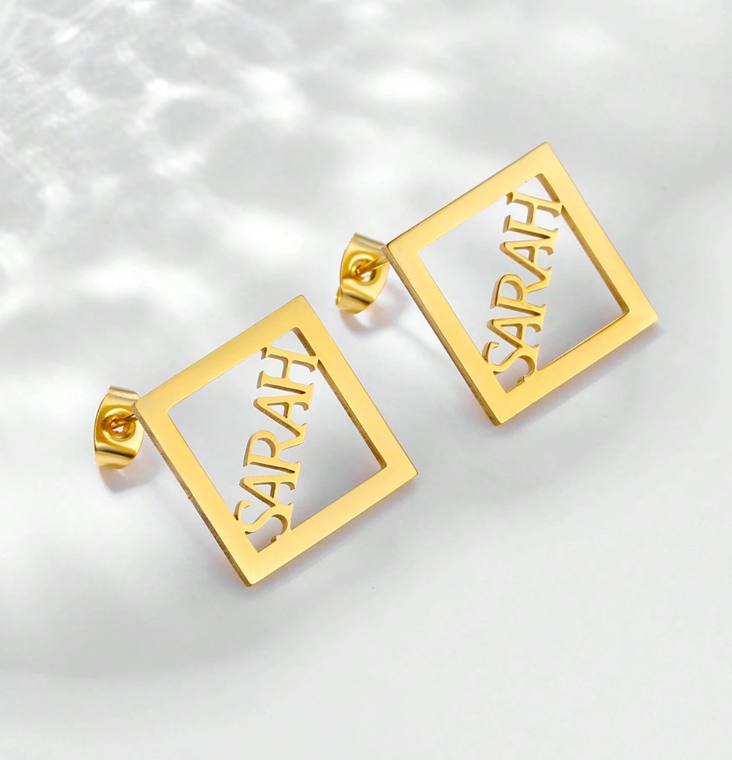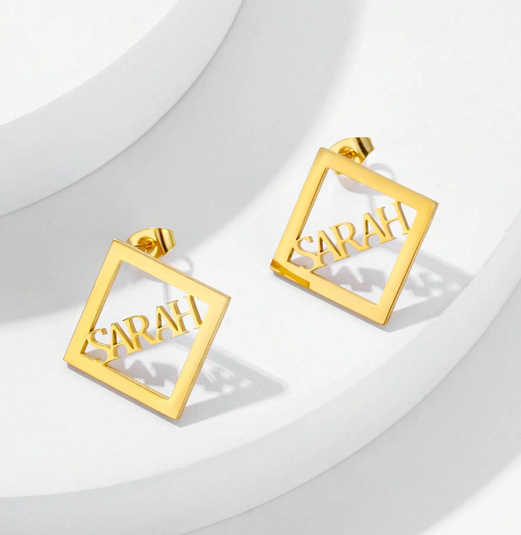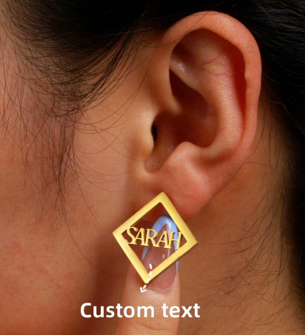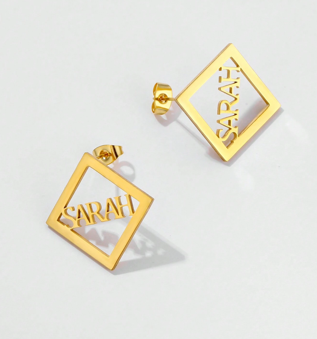 Crafted from 18k gold plating, these diamond-shaped stud earrings add a touch of sophistication to any outfit. What sets them apart is their ability to be personalized with a name of your choice, making them a unique and thoughtful gift option.