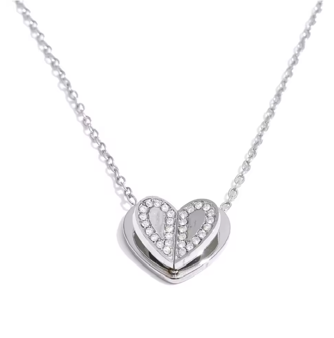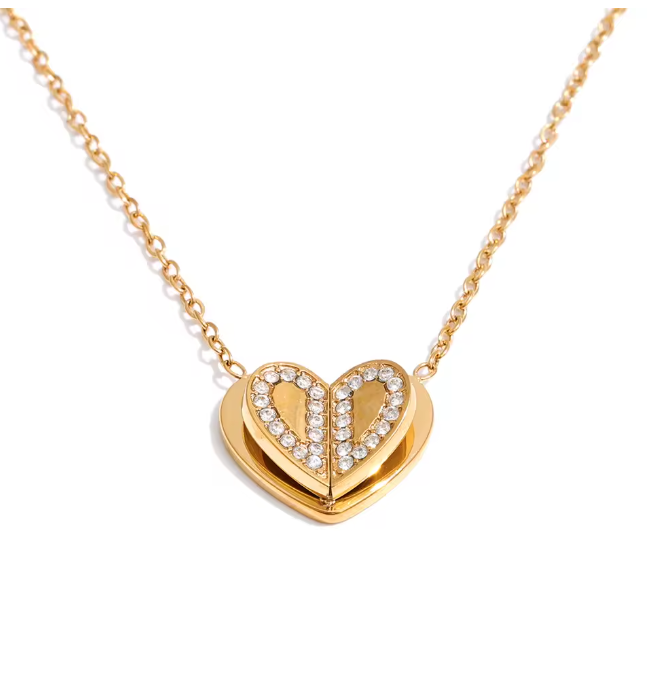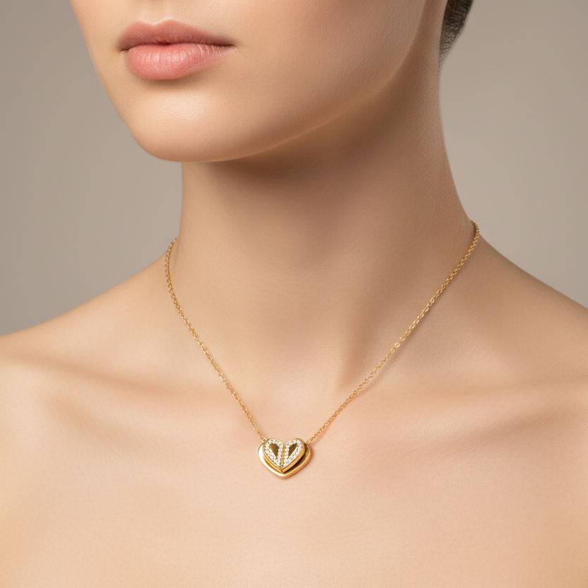 Soft sparkle meets timeless romance. The Fluttering Hearts Necklace features a beautifully layered heart design, detailed with shimmering crystals that catch the light from every angle.