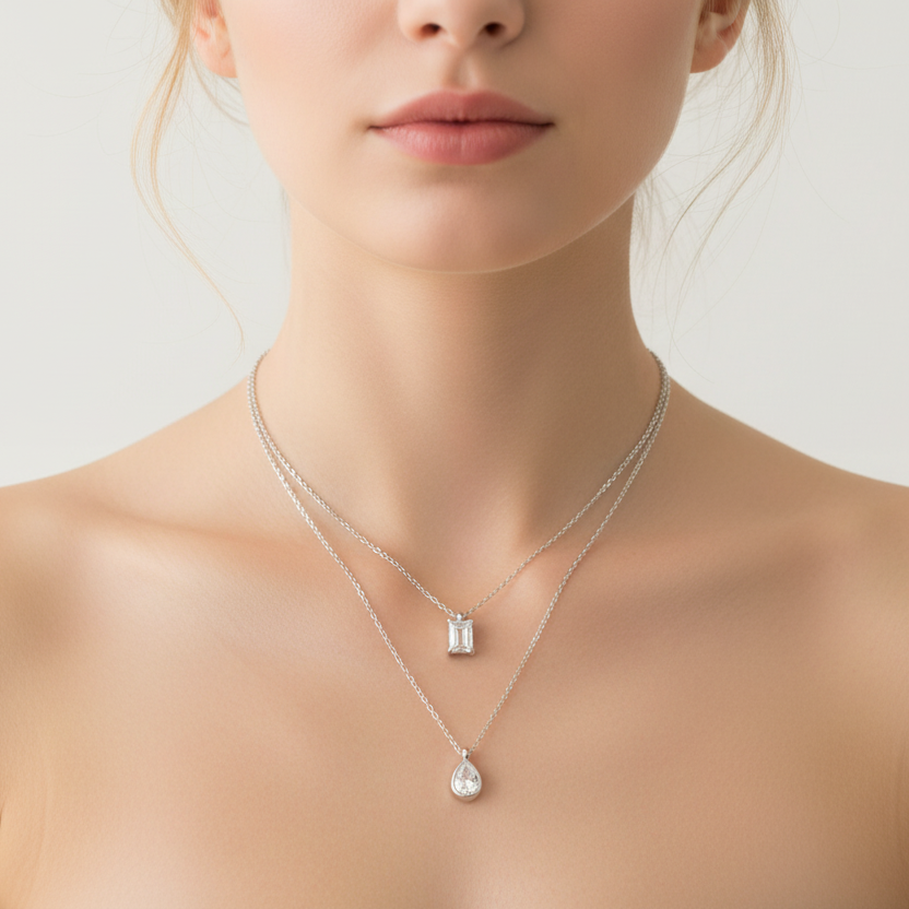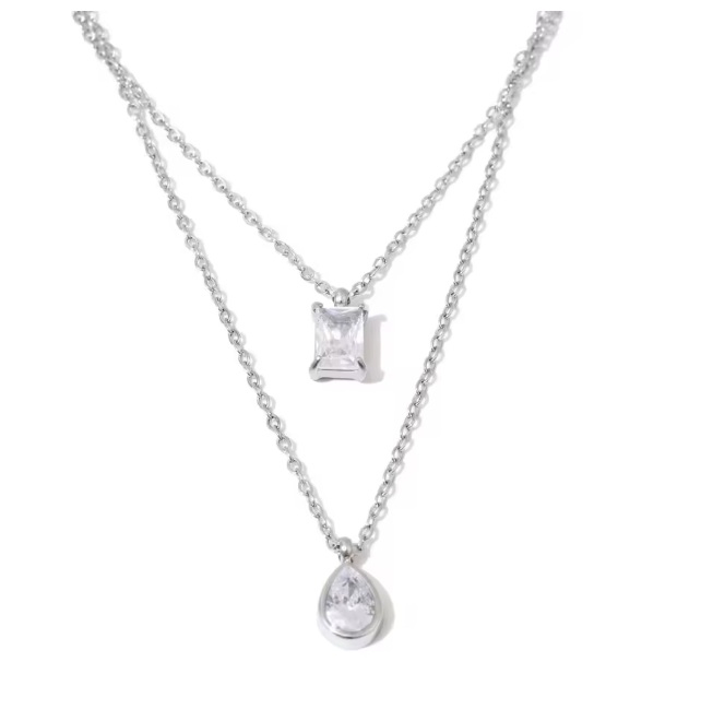 Meet The Imogen Layered Necklace, sleek, modern and effortlessly refined. Featuring two perfectly balanced layers with a radiant baguette-cut stone and a soft teardrop pendant, this piece gives you that layered look without the styling stress.