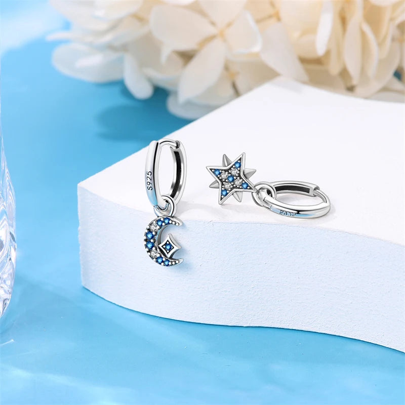 Crafted from 925 sterling silver, these hoop earrings feature delicate sun and moon charms adorned with captivating blue zircon stones. As the light catches these glittering gems, they shimmer like the night sky, adding a touch of celestial magic to any outfit.