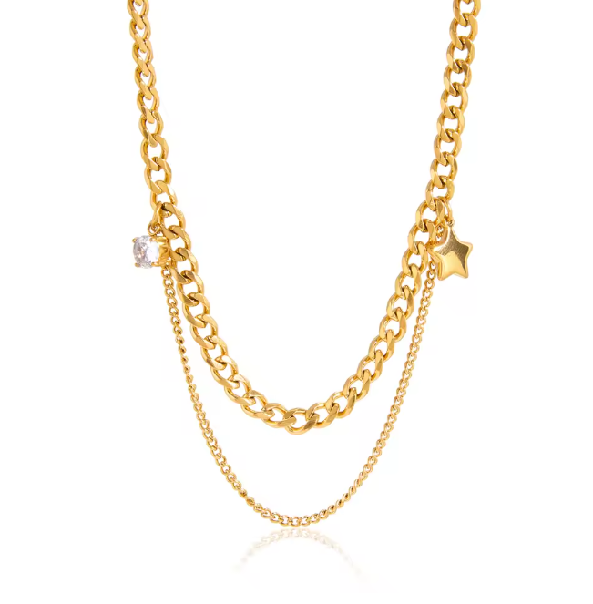 Meet The Viola Chunky Necklace, bold, layered and impossible to ignore. Featuring a striking double-chain design with a polished star charm and crystal detail, this 18K gold plated piece brings instant edge to any outfit.