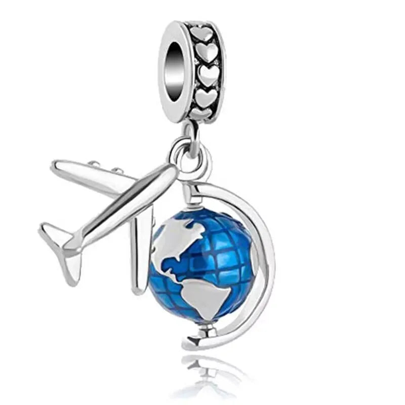 This exquisite charm bracelet features a delicate plane and a stunning blue globe charm, symbolizing the wanderlust within.