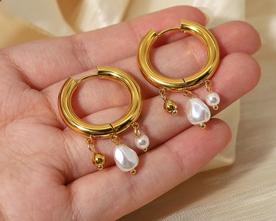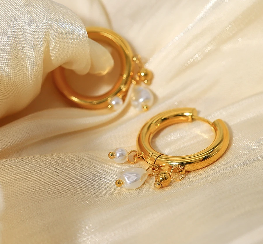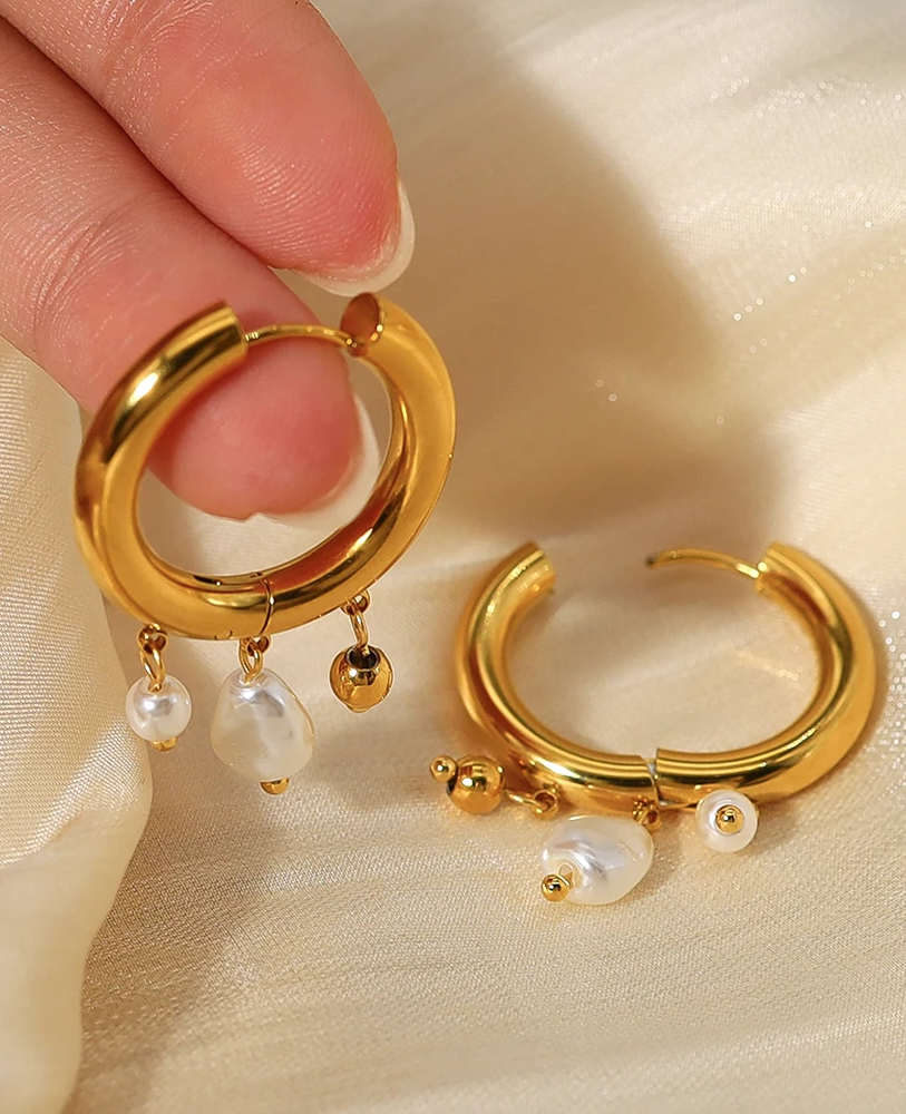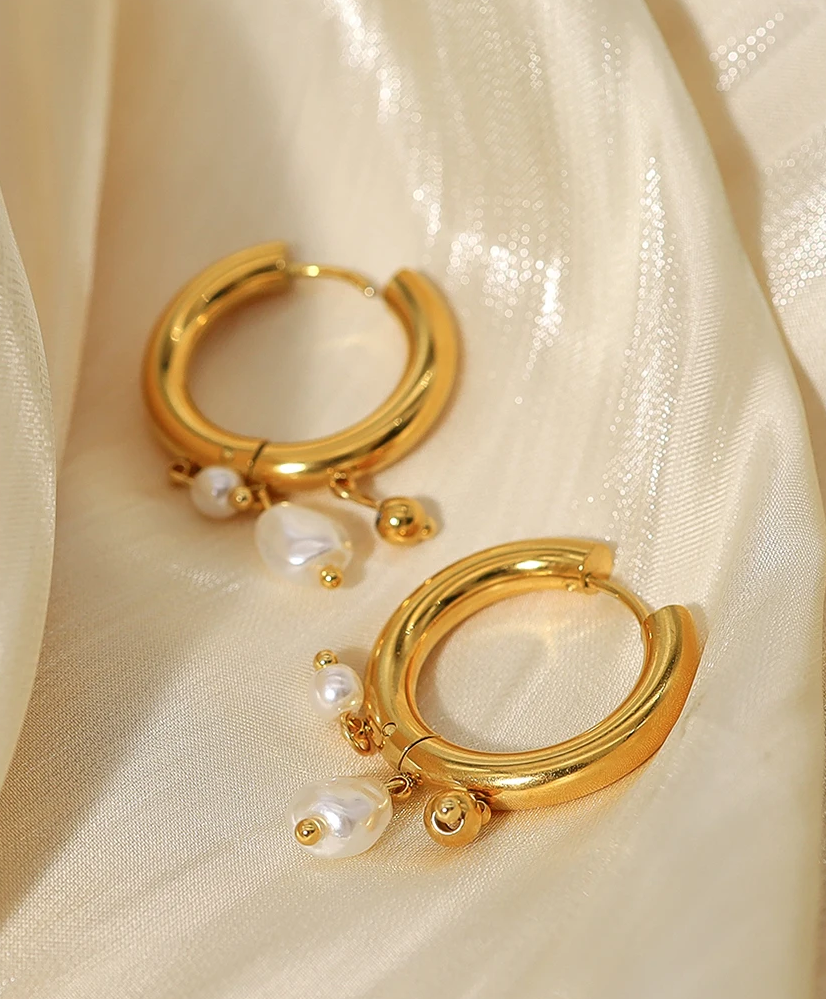 Crafted from 18K gold-plated hoops, these earrings feature delicate pearls dangling from the center, adding a touch of sophistication to any outfit. The waterproof and non-tarnish design ensures long-lasting beauty, making them a versatile accessory for any occasion.