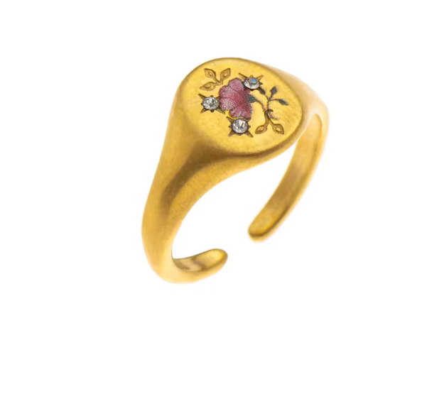 These aren't your typical signet rings. Our Vintage Romantics collection brings fairy tale vibes with a modern twist, think enchanted garden meets contemporary cool. Each adjustable 18K gold-plated ring features intricate enamel details that tell their own little love story.