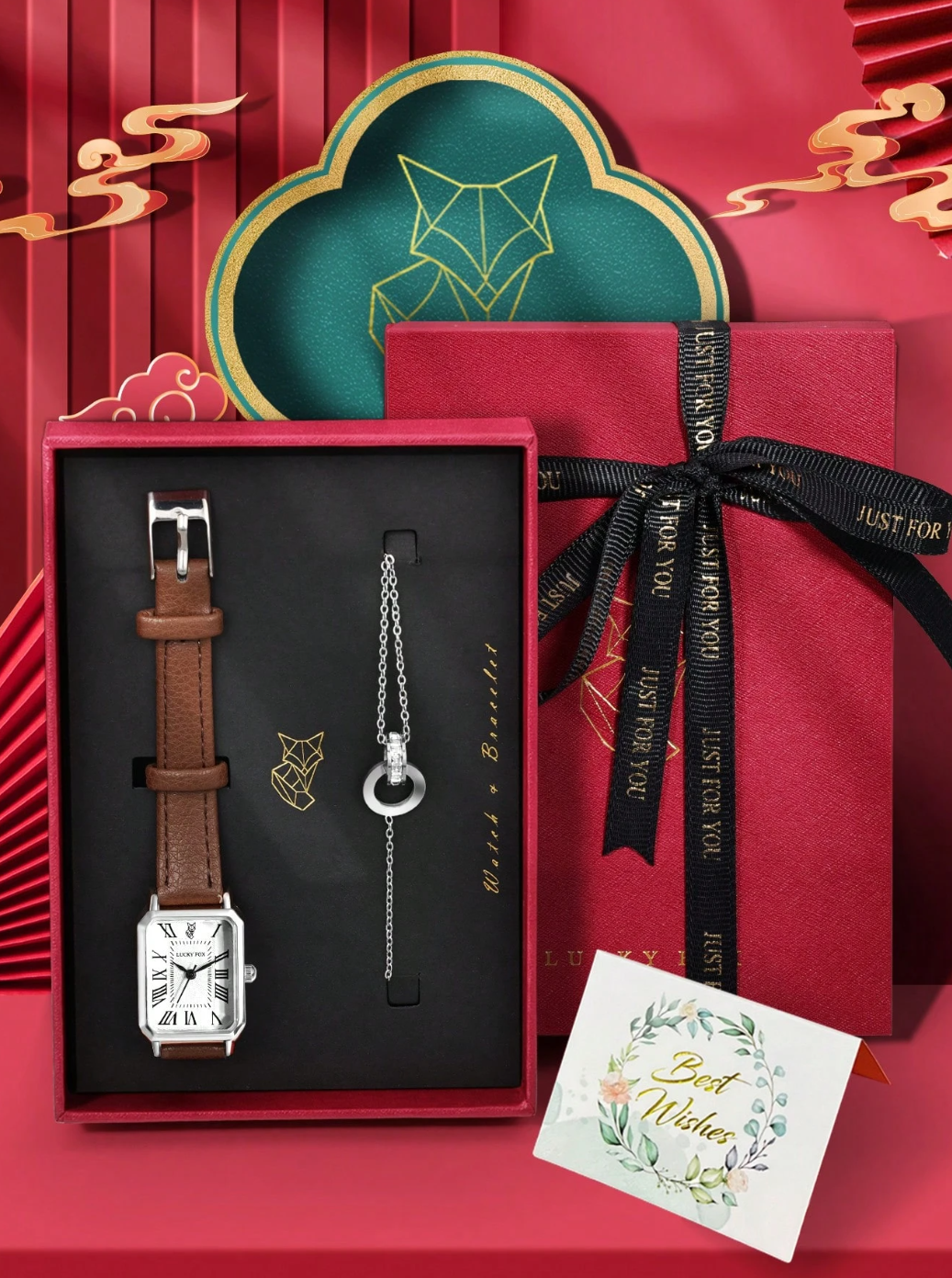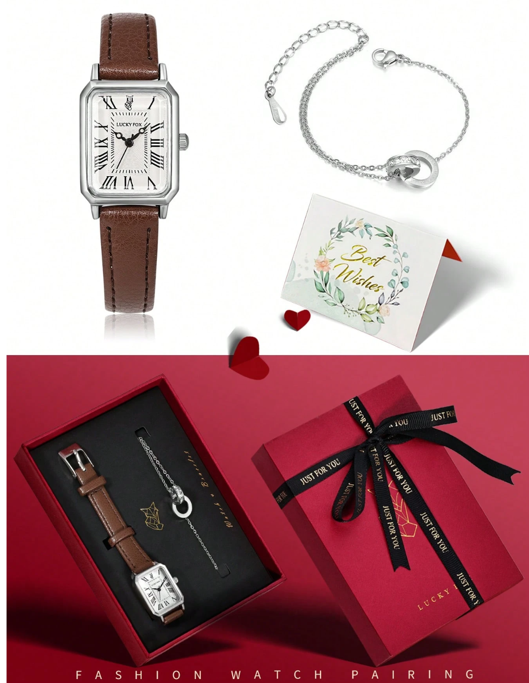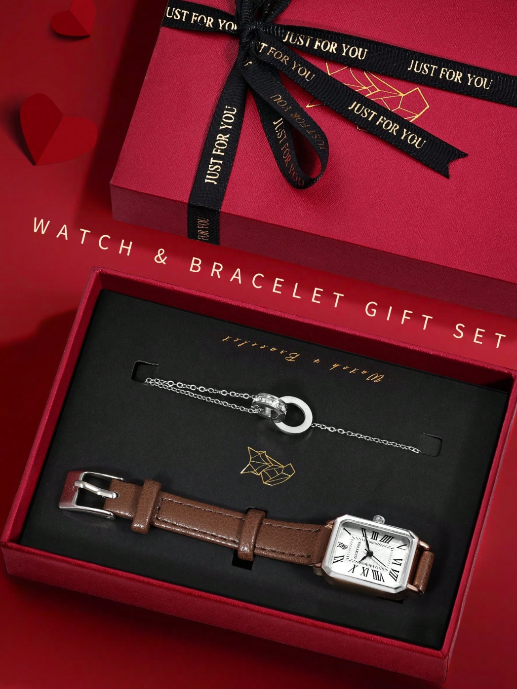 Timeless elegance meets chic simplicity with the Watch & Bracelet Gift Set—the ultimate pairing for effortless sophistication. This beautifully curated set includes a classic watch with a sleek leather strap and a dainty silver bracelet adorned with an interlocking charm, symbolizing unity and style.