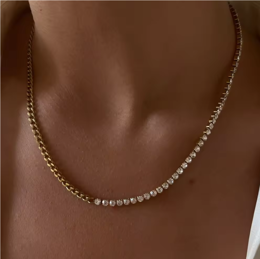 Crafted from 18K gold plating, this necklace showcases a unique design - one half features a delicate cuban link chain, while the other half dazzles with a zircon diamond tennis necklace.